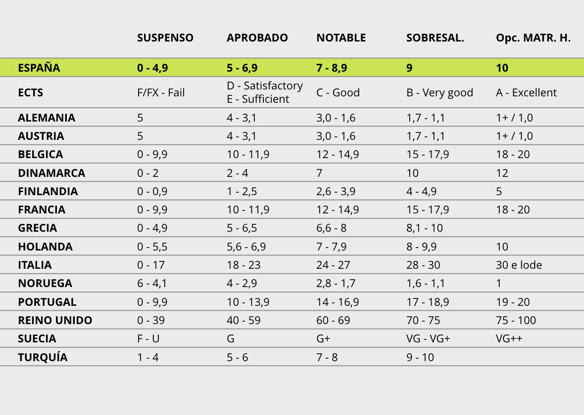 El Coordinador Erasmus determinará la equivalencia de las calificaciones reflejadas en el certificado académico siguiendo el procedimiento propuesto en la Guía de Uso del ECTS 2009: comparando la tabla de porcentajes de la escala de calificaciones de la institución de acogida con la tabla de porcentajes de la institución de origen. Si en el certificado académico no figura la tabla de porcentajes, el Coordinador Erasmus determinará la equivalencia de las calificaciones aplicando la tabla de conversión aprobada por la Comisión de Relaciones Internacionales.