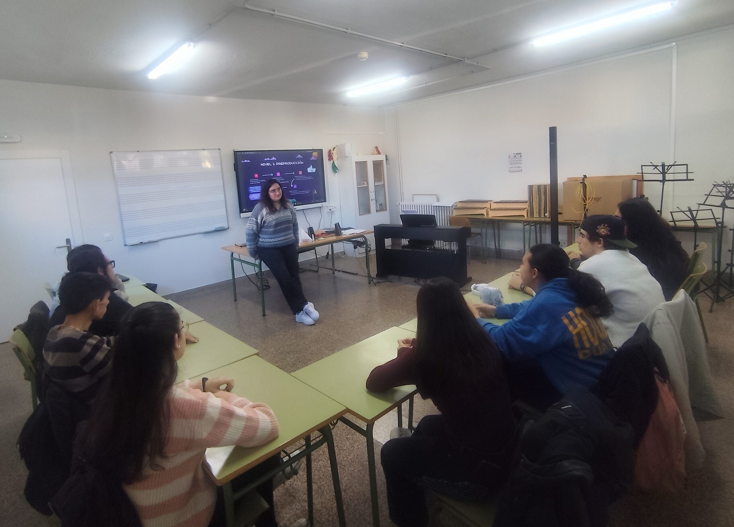 Durante la sesión, los estudiantes han podido descubrir las fases y los profesionales que intervienen en un proyecto de doblaje, los requisitos para convertirse en un buen actor en esta especialidad y el proceso seguido para realizar el doblaje de la conocida serie Adolescencia, gestionado por esta profesional.