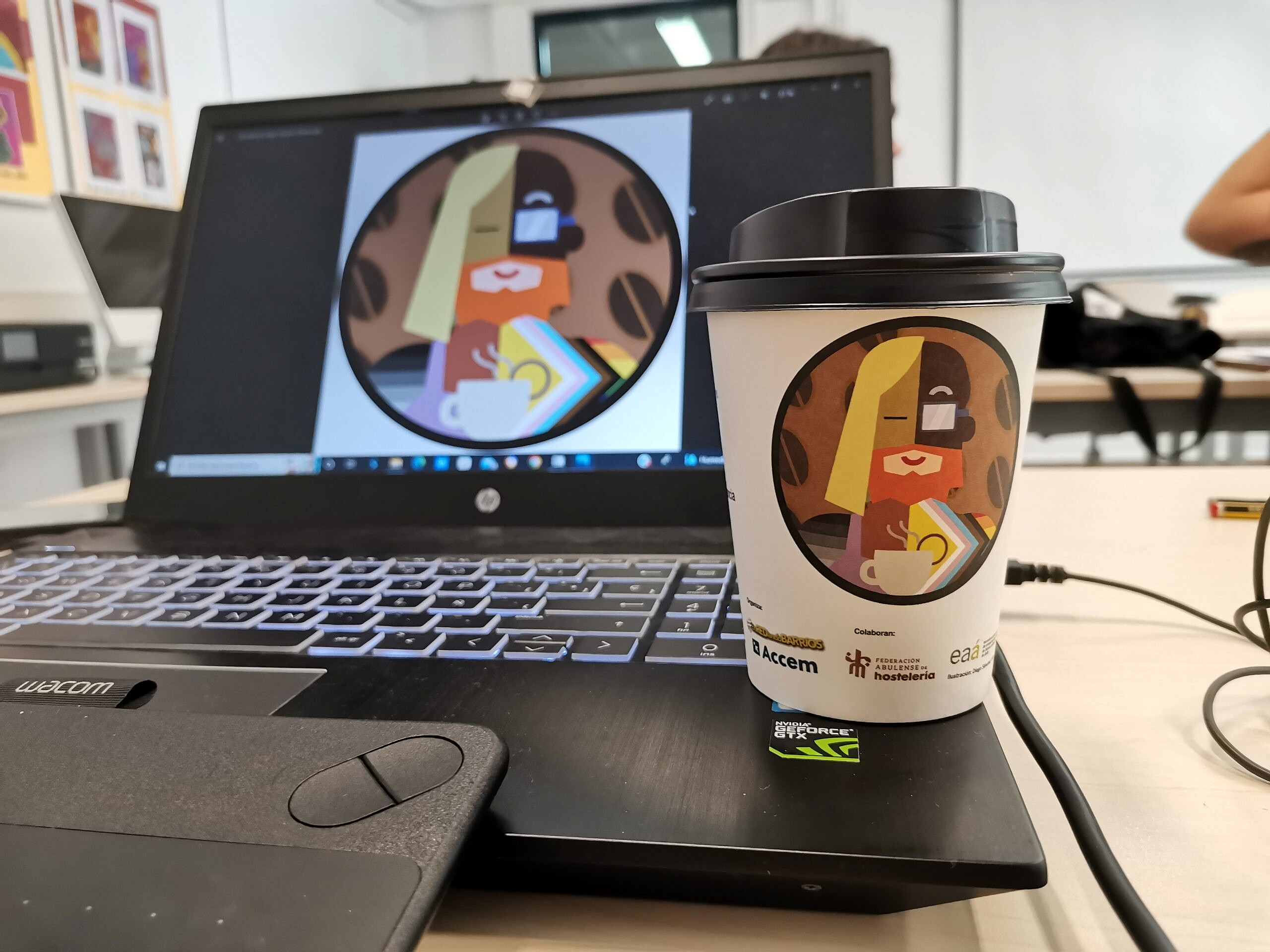 Los alumnos de 2º del Ciclo Formativo de Grado Superior de Ilustración de la Escuela han diseñado distintas ilustraciones para su utilización en una serie de vasos de cartón para café y que serán distribuidos este fin de semana por todos los bares y restaurantes de Ávila. De los diez diseños propuestos, se eligió el aportado por Diego Sánchez Villamor, aunque todos los alumnos desarrollaron ilustraciones fantásticas.