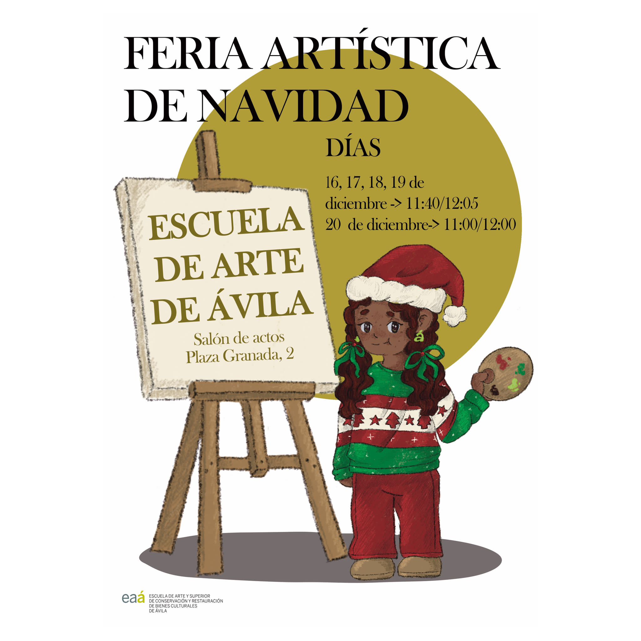 La sala de exposiciones de la Escuela de Arte de Ávila está siendo esta semana de diciembre, previa al descanso vacacional, escenario de una Feria Artística de Navidad en la que los alumnos del centro exponen productos diseñados y elaborados por ellos mismos (objetos de elaboración artesanal, pinturas, dibujos, diseños para tarjetas, calendarios, pegatinas… ) pudiendo ser adquiridos por sus compañeros y profesores, todo ello durante el periodo correspondiente al recreo (11:40 – 12:05 h).