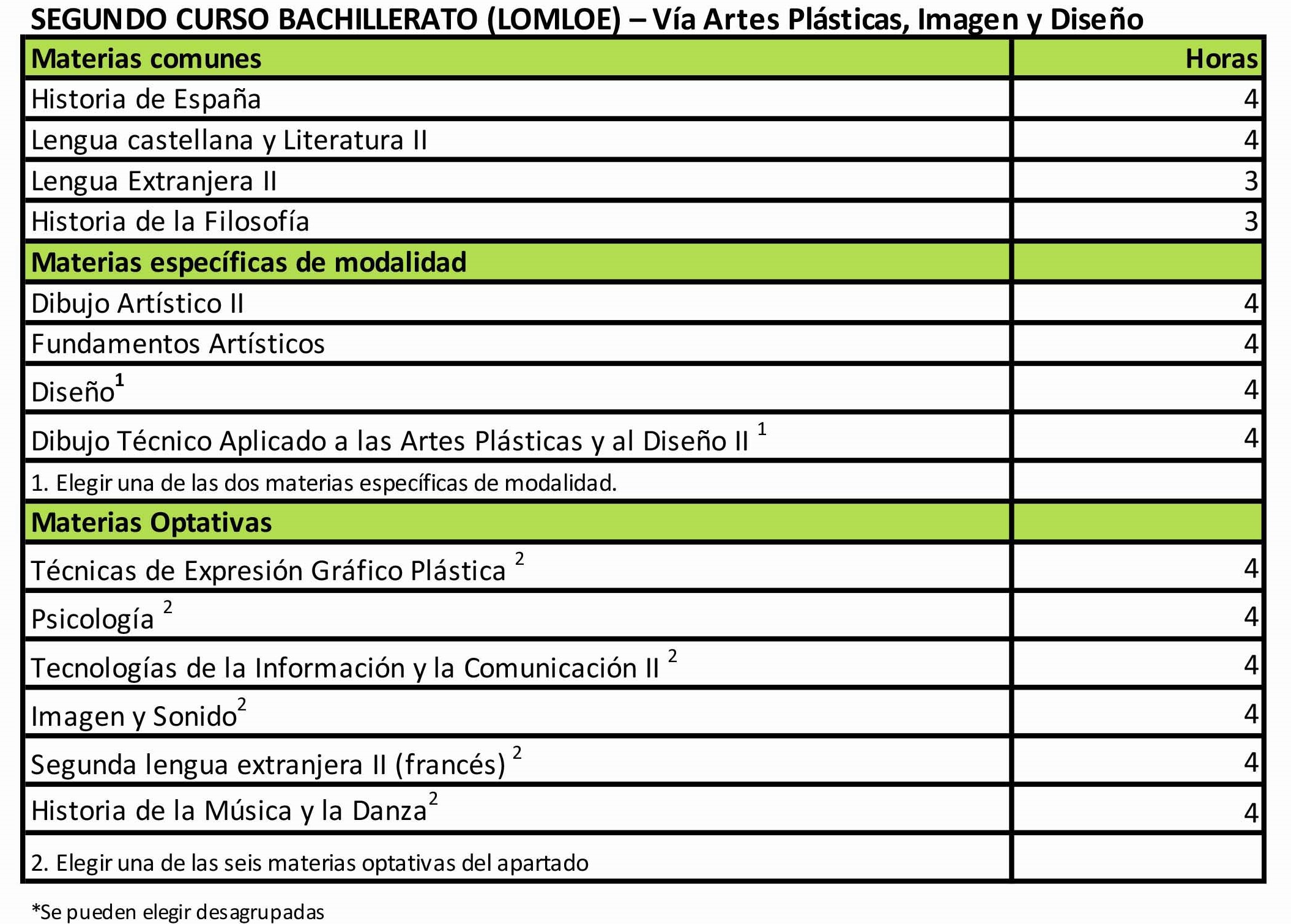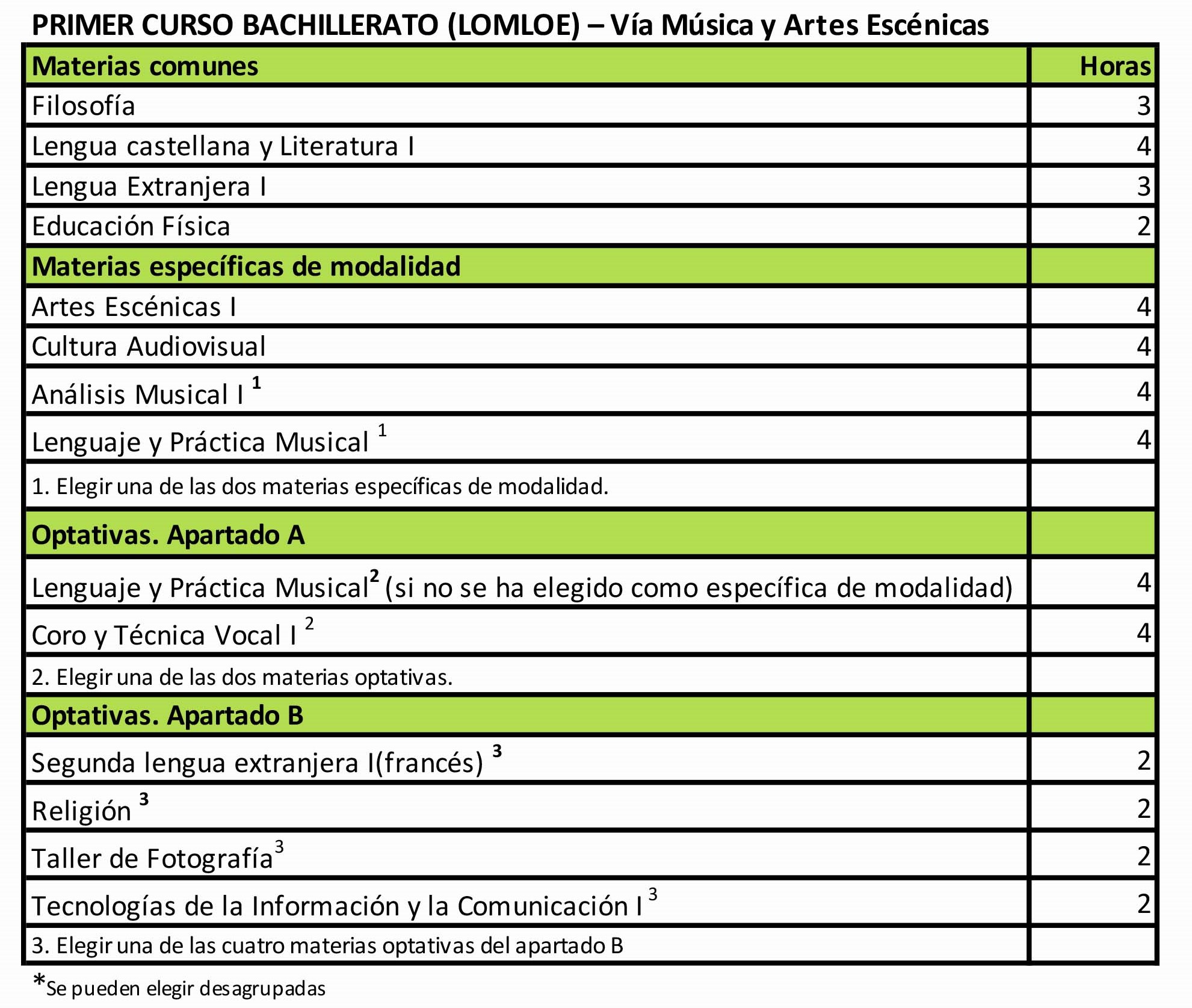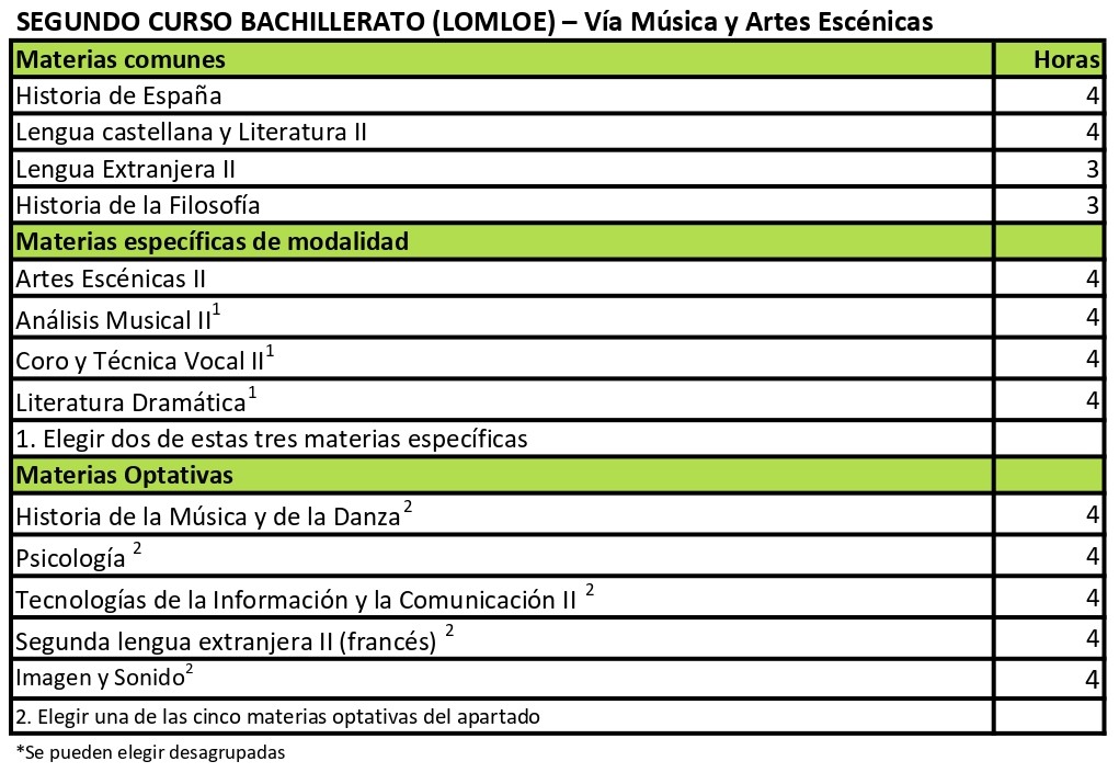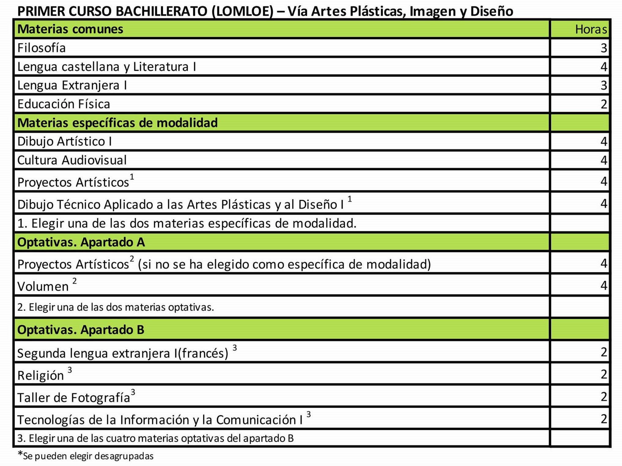 El bachillerato se estructura en dos cursos académicos. El horario semanal de cada uno de los cursos es de 30 períodos lectivos distribuidos de lunes a viernes. La distribución de las materias en cada curso de la etapa y el horario semanal correspondiente es el siguiente: